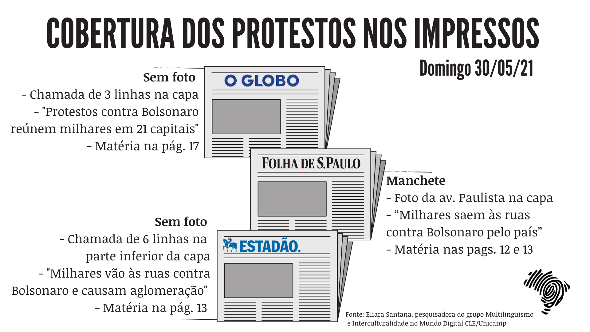 “O Estadão e O Globo, por exemplo, ignoraram solenemente o fato de que houve uma onda de manifestações que tomaram conta do dia 29 de maio, pedindo vacina, comida no prato e defendendo o impeachment do presidente Jair Bolsonaro, ou seja, optaram por não fazer jornalismo. É estranho, né? Não é uma manifestaçãozinha que acontece todo final de semana, é um fato social importante”, afirma Samuel Lima, jornalista, professor da Universidade Federal de Santa Catarina (UFSC) e pesquisador do Observatório da Ética Jornalística (objETHOS). No que se refere aos jornais impressos, ele classifica a cobertura como “uma tragédia”, mencionando a exceção da Folha, que deu o devido destaque aos atos.