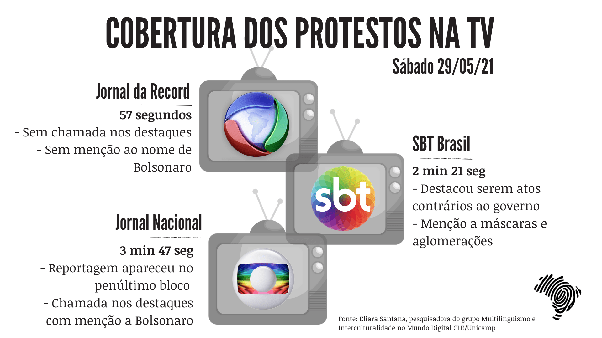 Na análise de três telejornais na noite dos protestos de 29M, a pesquisadora Eliara Santana aponta para diversas lacunas. O caso mais evidente de omissões e distorções é o Jornal da Record. Com apenas 57 segundos em uma hora de noticiário, a reportagem sobre as manifestações não menciona o nome de Bolsonaro – apenas cita governo federal na chamada – e dá a entender que as pessoas saíram às ruas para pedir vacina para todos. Outro aspecto é que “as imagens eram mais de perto, com câmera parada, sem dimensionar o tamanho das manifestações”, completa Santana.