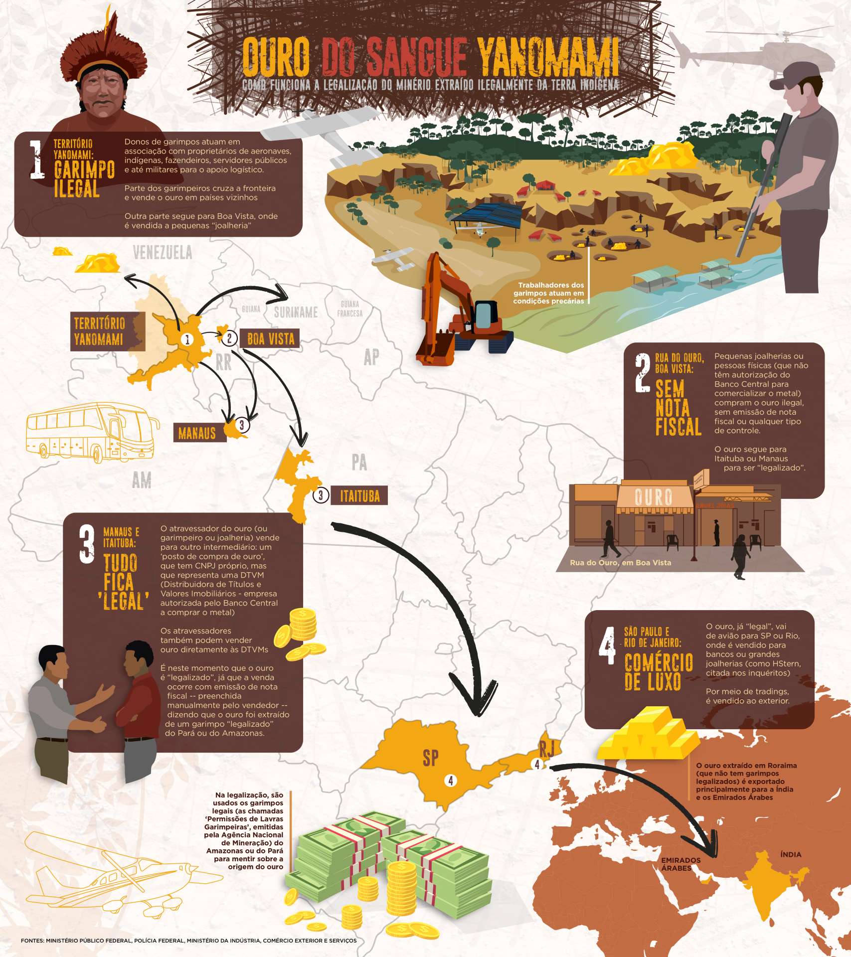 Os documentos também lançam luz sobre como funciona o esquema clandestino. Primeiro, parte do ouro extraído ilegalmente dos Yanomami vai diretamente aos países vizinhos (Venezuela, Suriname e Guiana Francesa) para ser vendido. Outra parte segue para Boa Vista, onde é comprado pelas pequenas joalherias da Rua do Ouro – mesmo sem terem a permissão do Banco Central para a aquisição do metal.