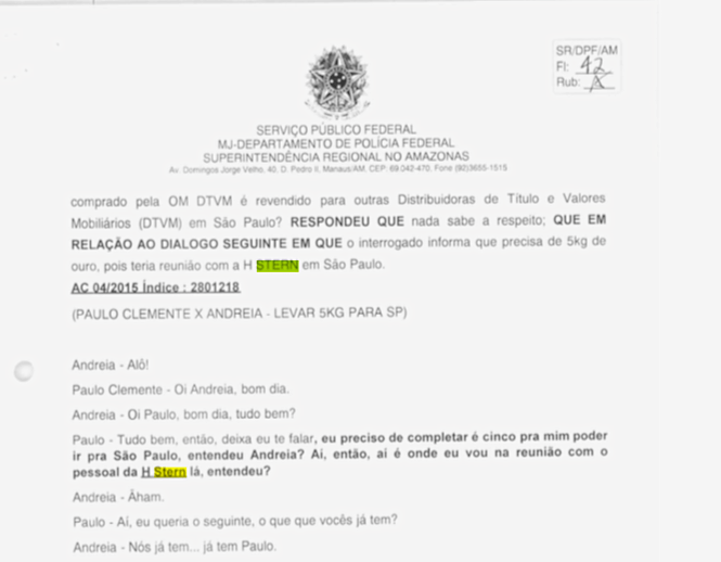 Em uma conversa ocorrida em abril de 2015, gravada pelos policiais, Paulo Clemente pede a Andreia Cavalcanti Lima, proprietária da Gold Joias, de Boa Vista, que separe 5 quilos de ouro para uma viagem a São Paulo a ser feita proximamente. Nessa viagem, Paulo Clemente afirma estar agendada uma reunião “com o pessoal da HStern”, sem especificar com quem seria o encontro.