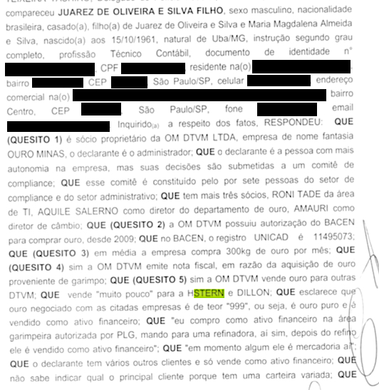Em outra evidência, o sócio e fundador da Ourominas, Juarez de Oliveira Filho, também cita a HStern em um depoimento que deu aos investigadores. Quando questionado pela PF se negociava ouro com a joalheria, ele não negou, dizendo apenas que “vendia muito pouco” à empresa.