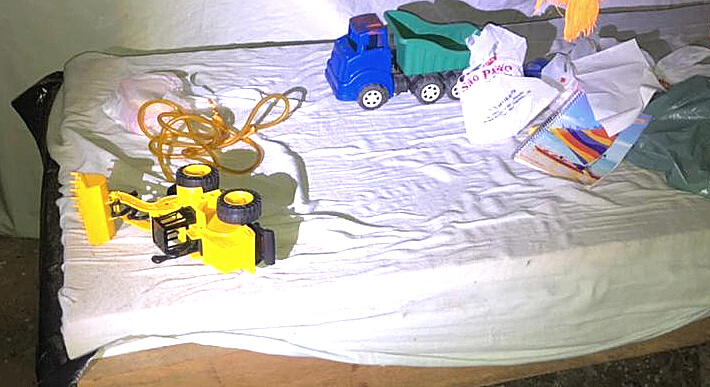 Nos registros fotográficos do dia do resgate, é possível ver um caderno e alguns brinquedos das crianças, próximo das embalagens de agrotóxico, motosserra, galões de óleo diesel e até um trator de verdade — parecido com aquele de plástico do menino.