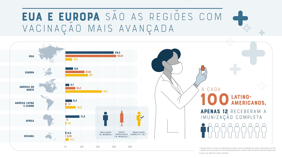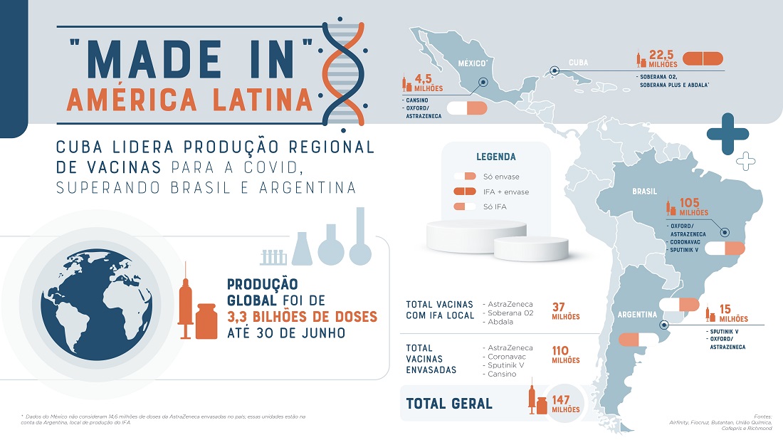 A lenta vacinação na América Latina é diretamente proporcional à sua baixa produção. Cerca de 3,3 bilhões de doses foram produzidas globalmente até 30 de junho, segundo levantamento da empresa de análises científicas Airfinity. A Ásia é quem mais fabricou, com 2,1 bilhões de unidades (63%), seguida por Europa, 794 milhões (23%) e Estados Unidos, 409 milhões (12%).