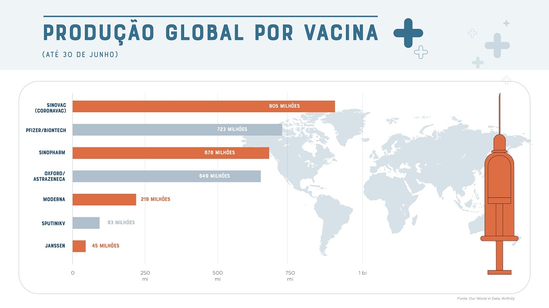 Os dados da Airfinity mostram que a produção mais acelerada é a das companhias chinesas Sinopharm e Sinovac. Ambas usam a tradicional tecnologia de vírus inativado e responderam por 60% da produção global no mês de junho. Considerando as 3,3 bilhões de doses produzidas desde o início da pandemia, quase 1,6 bilhão correspondem aos dois imunizantes (47% do total).