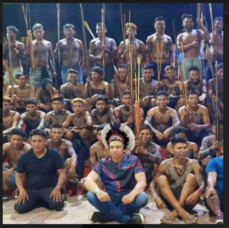 O garimpeiro Vilela é fundamental na articulação do lobby, pois costura alianças com parte dos indígenas. Na foto que usa em seu perfil no Whatsapp, ele está sentado à frente de um grupo dos Munduruku pintados para a guerra e armados com bordunas (Foto: WhatsApp)
