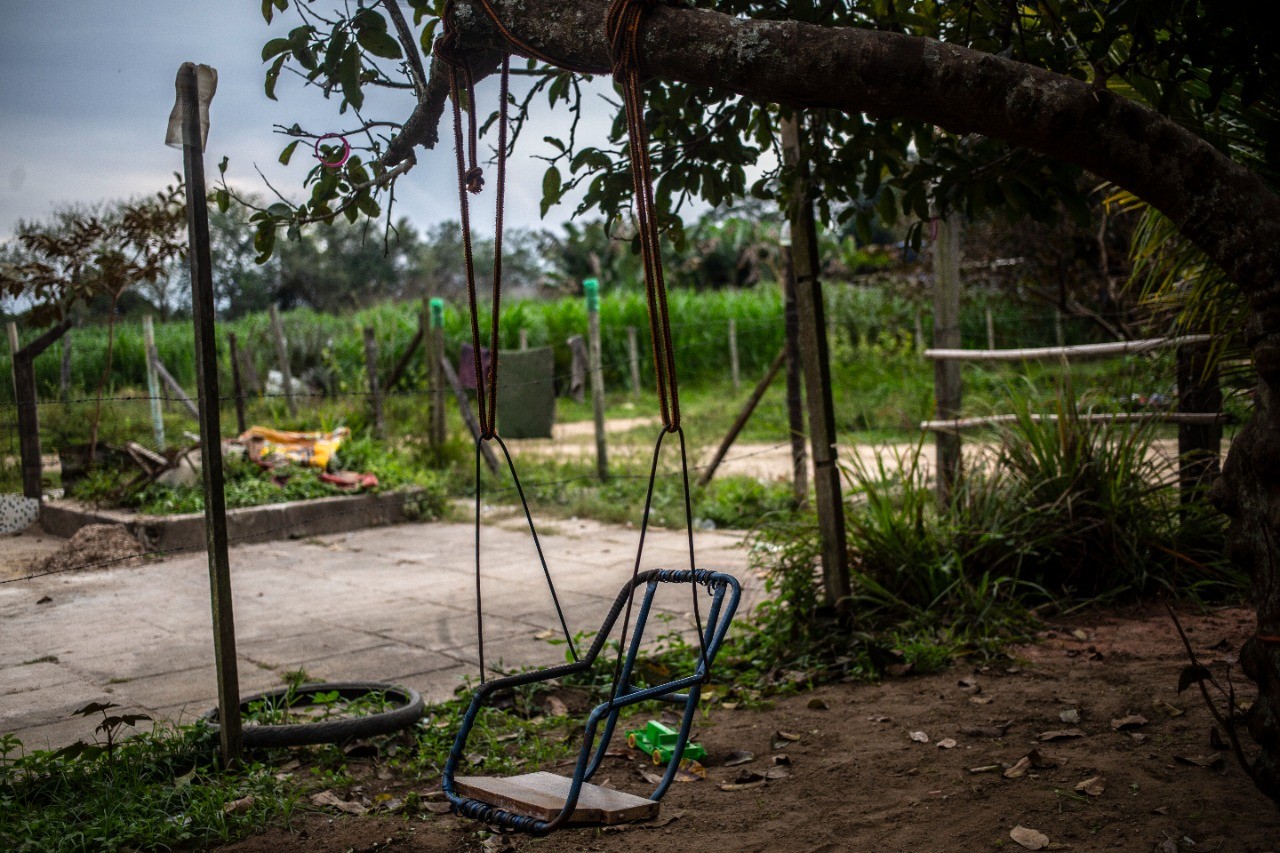 No quintal em frente ao instituto, ele improvisou um balanço em uma árvore – um brinquedo para os filhos, uma tentativa de transformar a escola abandonada em um lar.