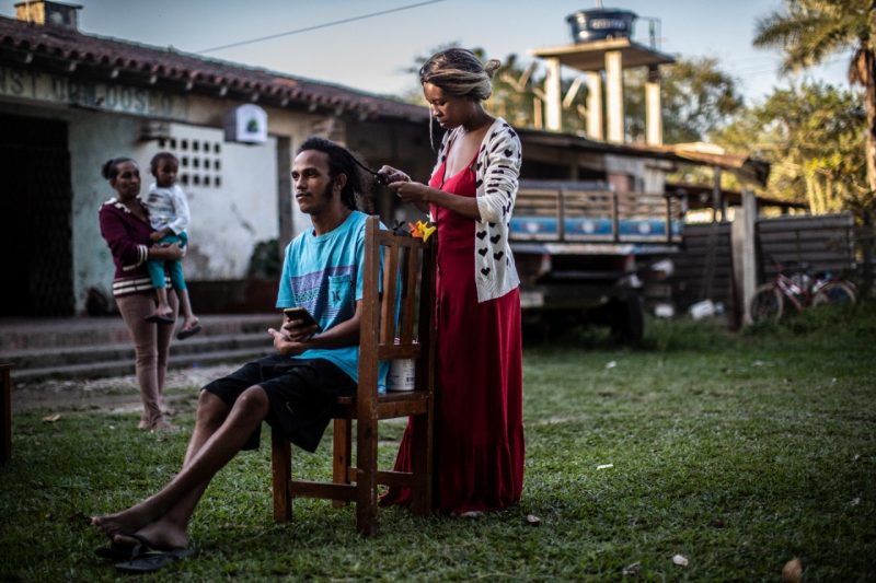 Mais de mil pessoas moram hoje na Cidade dos Meninos. Amanda da Silva arruma o cabelo do irmão em frente ao Instituto Dom Bosco, onde vive com a família