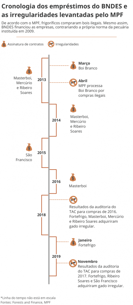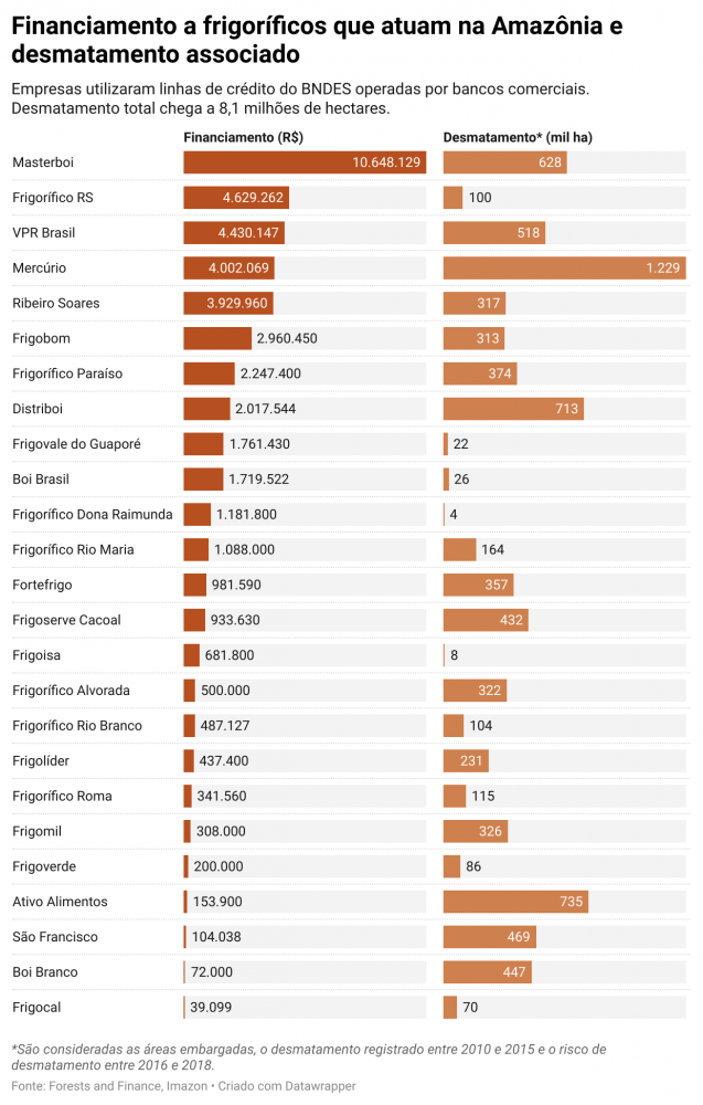 Segundo as auditorias do MPF, os frigoríficos Masterboi, Mercúrio, São Francisco (Sampaio), Ribeiro Soares e Fortefrigo compraram 5.441 cabeças de gado criadas em terras indígenas e 62.845 animais em fazendas desmatadas ilegalmente. Mas para o BNDES, esses fornecedores só devem ser excluídos da cadeia produtiva se tiverem condenação em todas as instâncias judiciais por esses crimes.