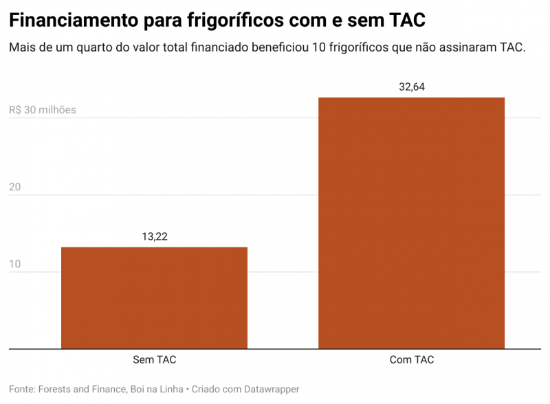 Embora o BNDES exija que os frigoríficos tenham sistemas de monitoramento para checar a origem dos animais abatidos, 10 empresas que receberam um total de R$ 13,2 milhões não assinaram o TAC da Carne com o MPF. Segundo o pesquisador do Imazon, esse é um forte indicativo de que esses abatedouros não possuem tais sistemas. “Em geral, quem não assina o TAC, não monitora rebanhos”, observa.