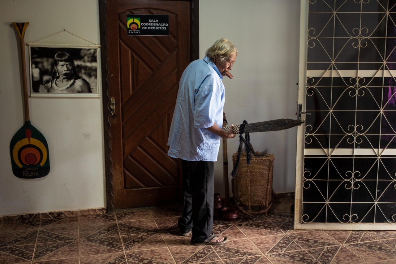 As estantes do Instituto Raoni abrigam diplomas do cacique, além de fotos com reis, papas, presidentes e ícones pops, como o cantor Sting, com quem fez uma turnê por quase 20 países no final da década de 80. A instituição fica em uma avenida sem calçamento em Peixoto de Azevedo, uma cidade garimpeira no norte do Mato Grosso, às margens da BR-163 – rodovia sempre atulhada de caminhões gigantes carregados de soja e de outdoors de apoio a Bolsonaro.