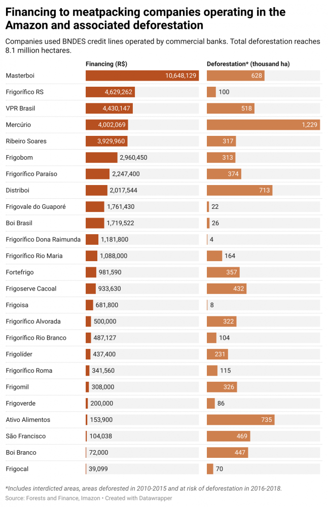 The data used in this report were obtained by the Forests and Finance coalition, which monitors the support given by banks and credit institutions to potentially deforesting activities. The group tracked a total of US$ 2.3 billion in BNDES loans for livestock that threaten Brazil’s environment.