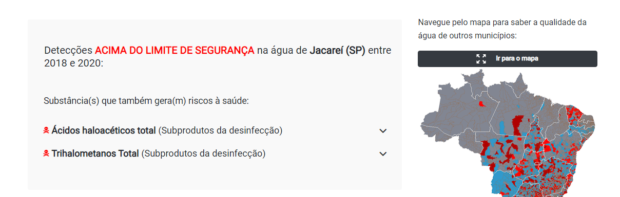 Primeiramente parabenizo pelo site Mapa da Água que visa tornar transparente as informações sobre a qualidade da água distribuída em nosso País.Ao consultar no site https://mapadaagua.reporterbrasil.org.br/  a cidade de Jacareí (SP) foi encontrado a citação abaixo: