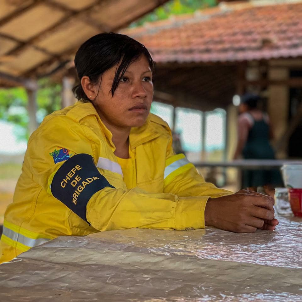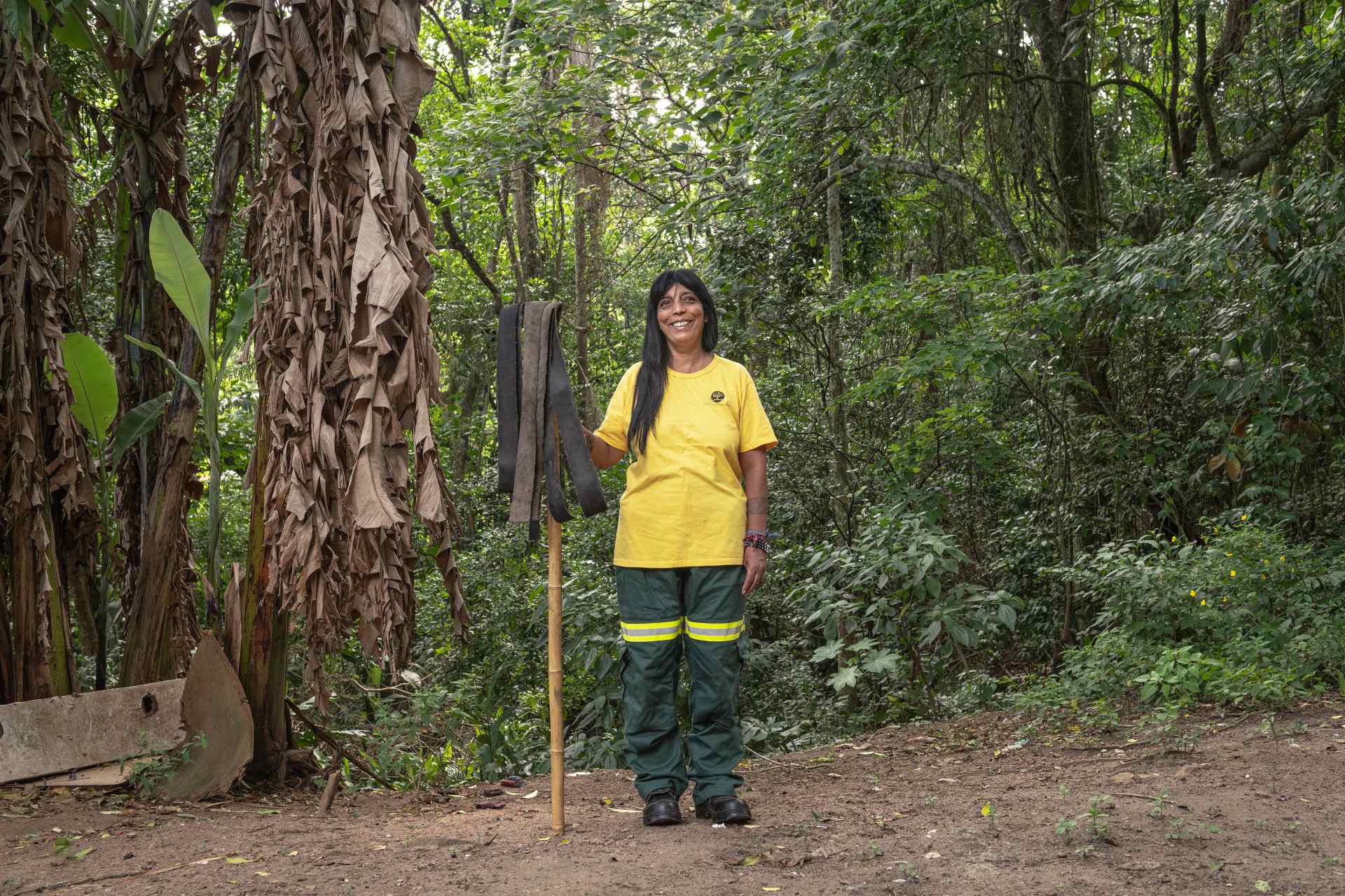 “Não adianta só a gente falar que protege a floresta, tem que atuar. E o melhor jeito pra isso é sendo brigadista. Na mata em fogo, a gente entra sem saber como vai sair. São muitos os riscos pois estamos na linha de frente, mas é gratificante”, diz a indígena Guarani. “Nosso pensamento é um só: o de acalmar o fogo. É como se a gente chegasse na queimada e falasse pro fogo: ‘calma, a gente vai te acalmar’, como um psicólogo. É com essa sabedoria que temos da natureza que combatemos o fogo.”
