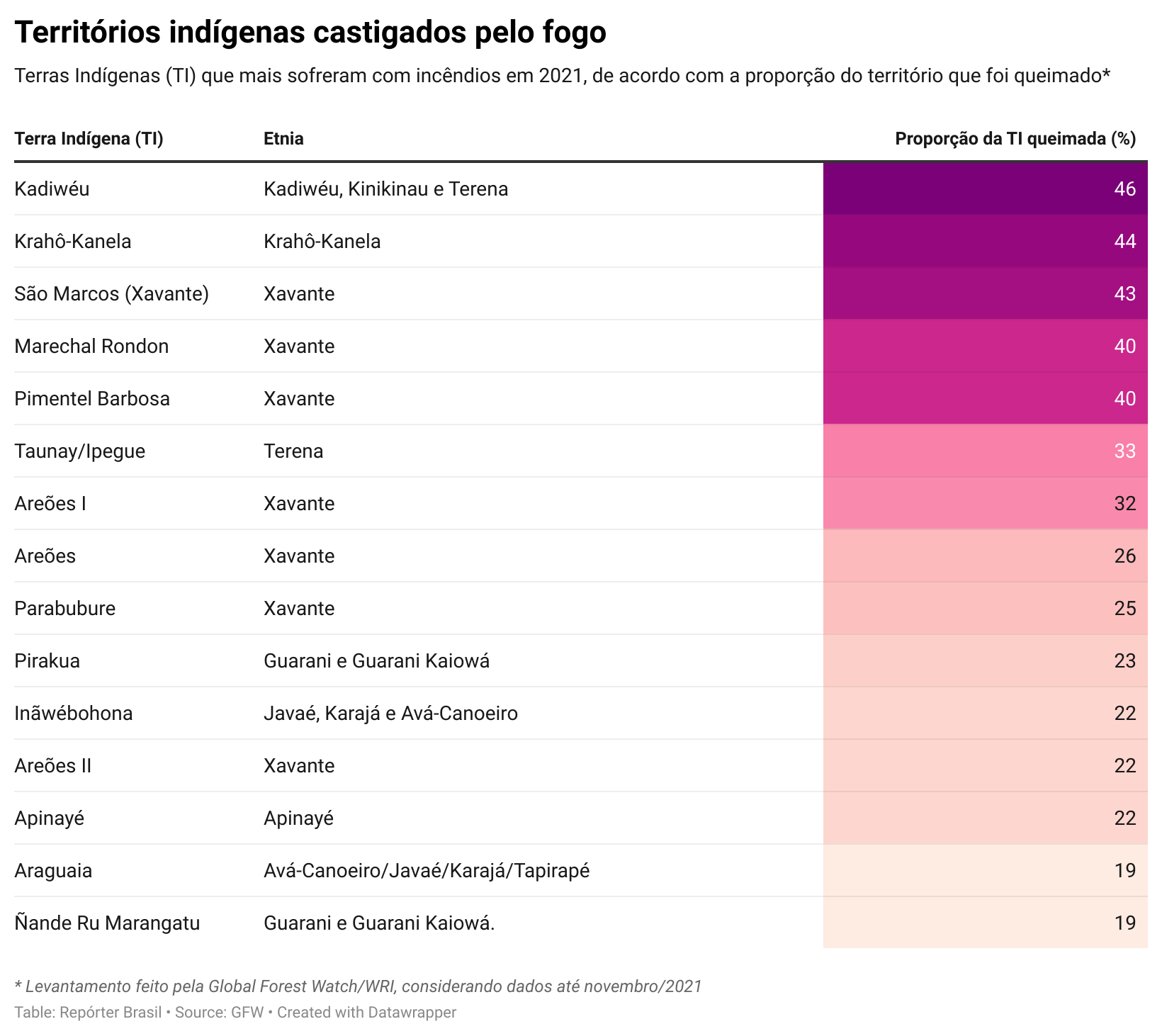 Os dados da GFW revelam também que a tragédia estava anunciada – e localizada. Isso porque das dez terras indígenas com mais focos de incêndio em 2021, oito já constavam no mesmo ranking feito no ano anterior: Araguaia, Kadiwéu, Pimentel Barbosa, Parabubure, Areões, Xingu, Raposa Serra do Sol e Apyterewa.
