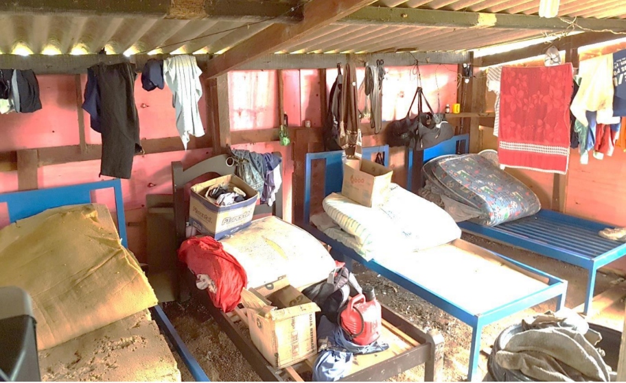 Já os trabalhadores rurais resgatados viviam em barracos, um deles tão precário que recebeu o apelido de “curral do meio”. Tinha chão de terra batida, nenhuma porta ou janela e as paredes, incompletas, eram feitas de lona, madeira e outros materiais improvisados. Um casebre sem teto fazia as vezes de banheiro, enquanto as camas eram colchonetes velhos, restos de espuma e papelão empilhado.