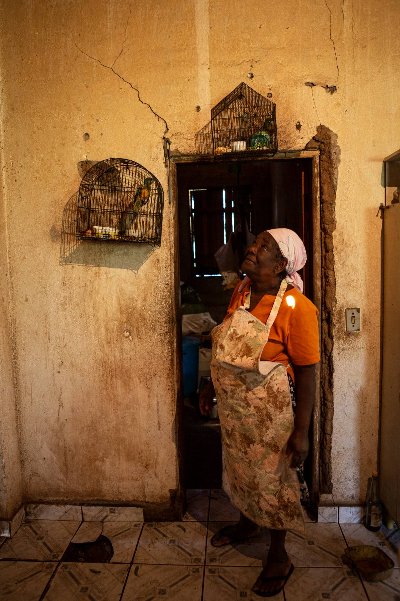 A imagem de Iemanjá está ao lado de Cristos crucificados, pôsteres do Vasco da Gama, fotos dos netos e de uma Nossa Senhora segurando uma folha de espada de São Jorge. As paredes de barro da casa de Leonisia Maria Ribeiro estão repletas de crenças, mas nos últimos anos ganharam marcas que até a sua fé duvida. São rachaduras que atravessam os tijolos de adobe e desassossegam a benzedeira. “Essas bombas só faltam matar a gente”, lamenta.