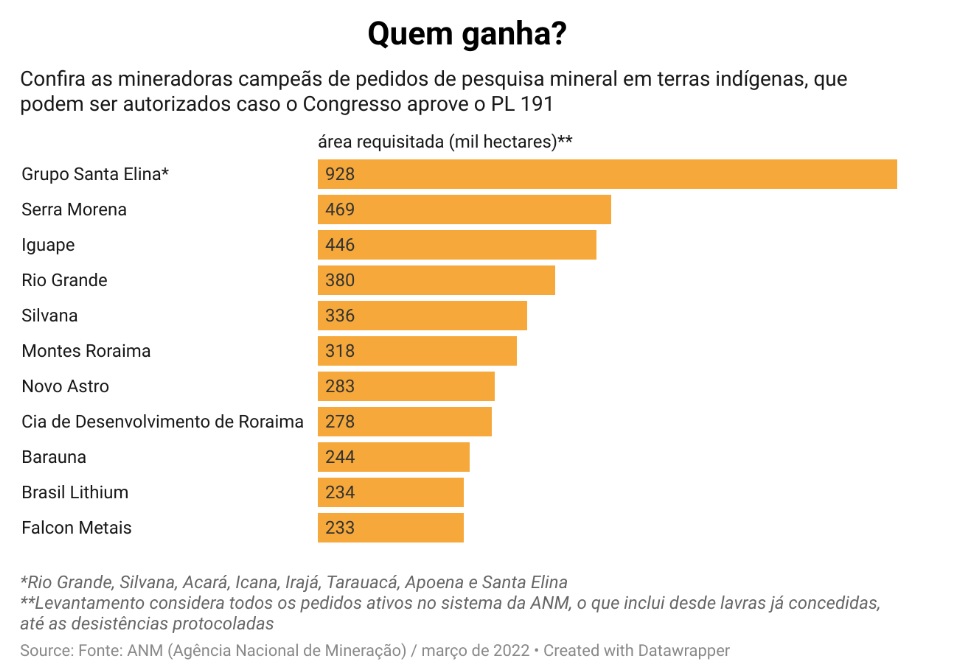 O levantamento foi feito pela ANM a pedido da Repórter Brasil em março, às vésperas de os deputados federais aprovarem urgência na tramitação do PL 191/2020, o projeto de lei que tenta liberar atividades econômicas em terras indígenas. Em meio a protestos, o PL perdeu apoio no Congresso, mas o assunto pode voltar a qualquer momento. Se aprovada mais essa “boiada ambiental”, quem sai na frente hoje é o grupo Santa Elina.
