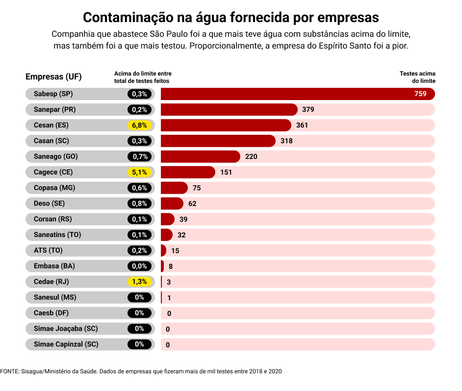 O problema da água contaminada com substâncias químicas acima do limite e da falta de transparência na comunicação aos consumidores atinge todo o Brasil. Em termos proporcionais, as empresas de abastecimento que mais tiveram problema com a qualidade da água foram a Cesan no Espírito Santo (6,8%) e a Cagece no Ceará (5,1%).