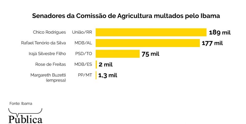 Os mesmos senadores que hoje analisam mudanças na lei que podem ter impactos ao meio ambiente já foram multados em quase meio milhão de reais pelo Ibama. Levantamento inédito realizado pela Agência Pública e Repórter Brasil revela que, nos últimos 23 anos, cinco senadores da Comissão de Agricultura foram multados em R$ 444,9 mil por infrações e crimes ambientais, como desmatamento.