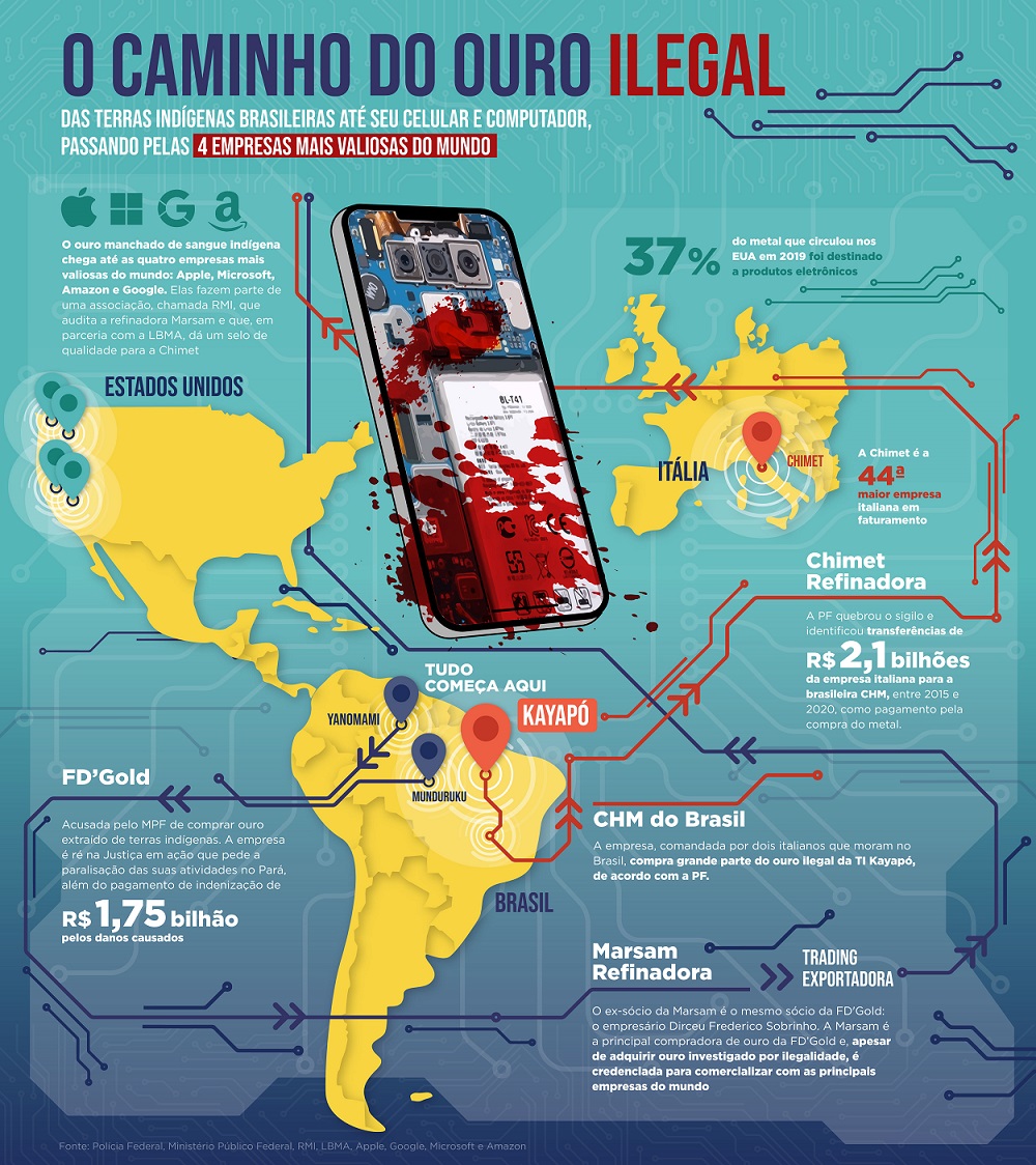 Documentos obtidos pela reportagem confirmam que essas gigantes da tecnologia compraram, em 2020 e 2021, o metal de diversas refinadoras, entre elas a italiana Chimet, investigada pela Polícia Federal por ser destino do minério extraído de garimpos clandestinos da Terra Indígena Kayapó, e a brasileira Marsam, cuja fornecedora é acusada pelo Ministério Público Federal de provocar danos ambientais por conta da aquisição de ouro ilegal. A extração mineral em terras indígenas brasileiras é inconstitucional, apesar dos esforços do governo Jair Bolsonaro (PL) para legalizá-la.