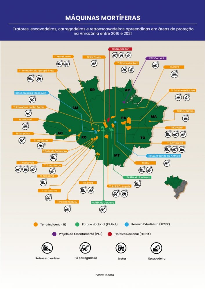 Via Lei de Acesso à Informação, a Repórter Brasil encontrou 157 ocasiões em que equipes de fiscalização apreenderam ou destruíram máquinas de 19 marcas em garimpos ilegais abertos em terras indígenas ou unidades de conservação, nos últimos cinco anos. É um dado conservador, pois as planilhas fornecidas trazem centenas de outros registros de queima de maquinário – para o relatório só foram contabilizados aqueles que dizem explicitamente que a atividade ocorria em áreas protegidas.
