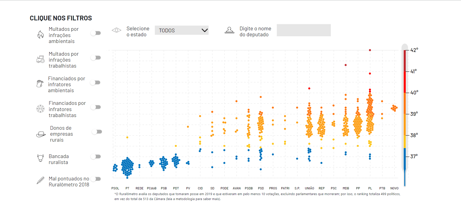 Em sua segunda edição, o Ruralômetro é um banco de dados e uma ferramenta interativa que avalia a atuação dos deputados federais em temas ligados ao meio ambiente, trabalhadores rurais, povos indígenas e outras comunidades tradicionais. O projeto pontua os parlamentares com base em como votaram e nos projetos de lei que apresentaram na atual legislatura, além de trazer outras informações relevantes, como as multas ambientais e trabalhistas dos políticos e de seus financiadores de campanha.