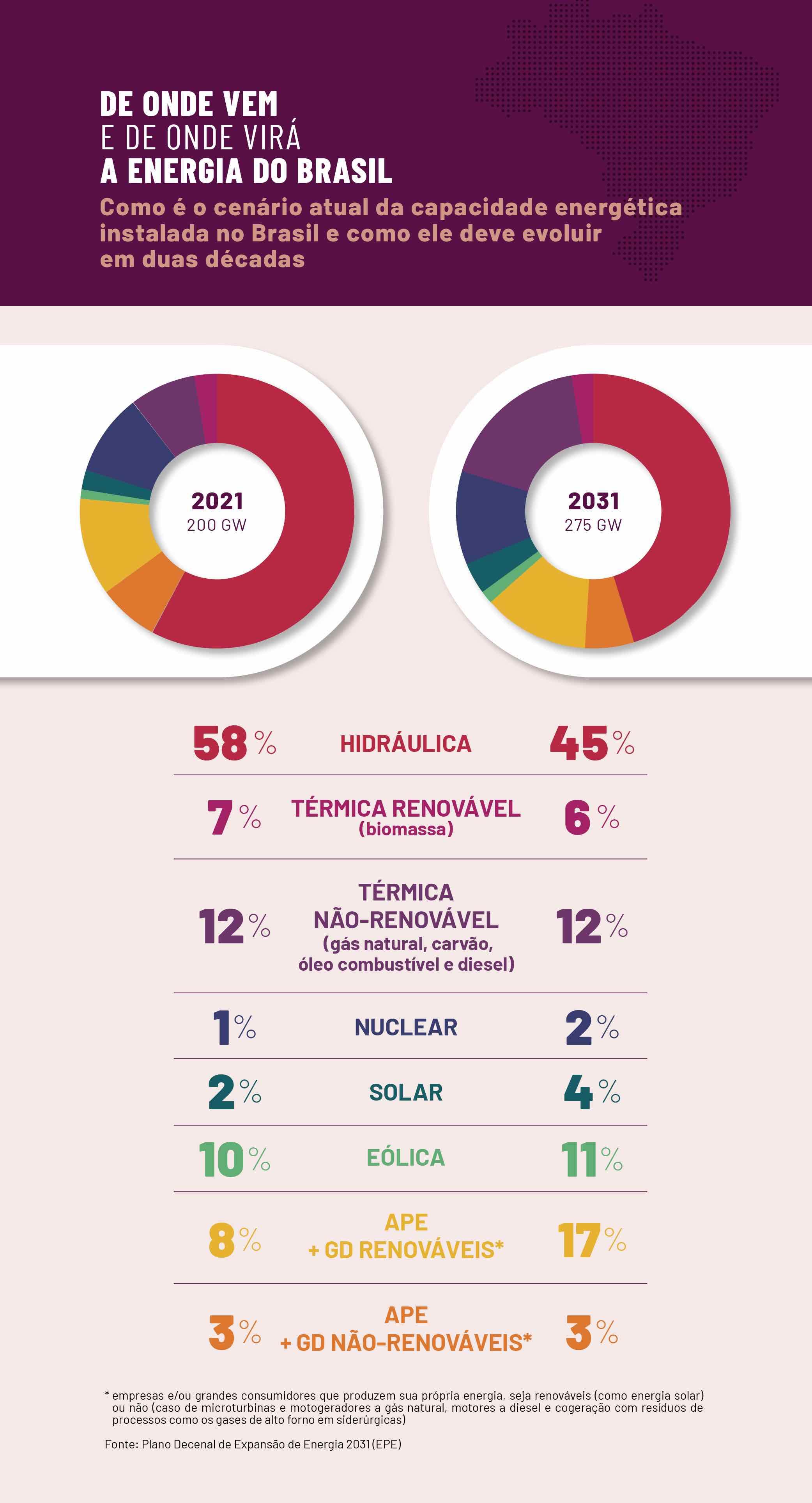 Hoje, as hidrelétricas respondem por cerca de 60% da eletricidade do país. Eólicas e solares – que há 20 anos, geravam menos de 1% do que o Brasil consumia – hoje representam cerca de 20%. O gás natural também ganhou espaço: hoje cerca de 10% da capacidade instalada no país é de termelétricas com base no insumo, sendo que na estiagem do ano passado, quando a palavra racionamento voltou a ser discutida, essas usinas chegaram a responder por 25% da eletricidade consumida no país. Lenha, carvão e nucleares respondem por outros 3%.