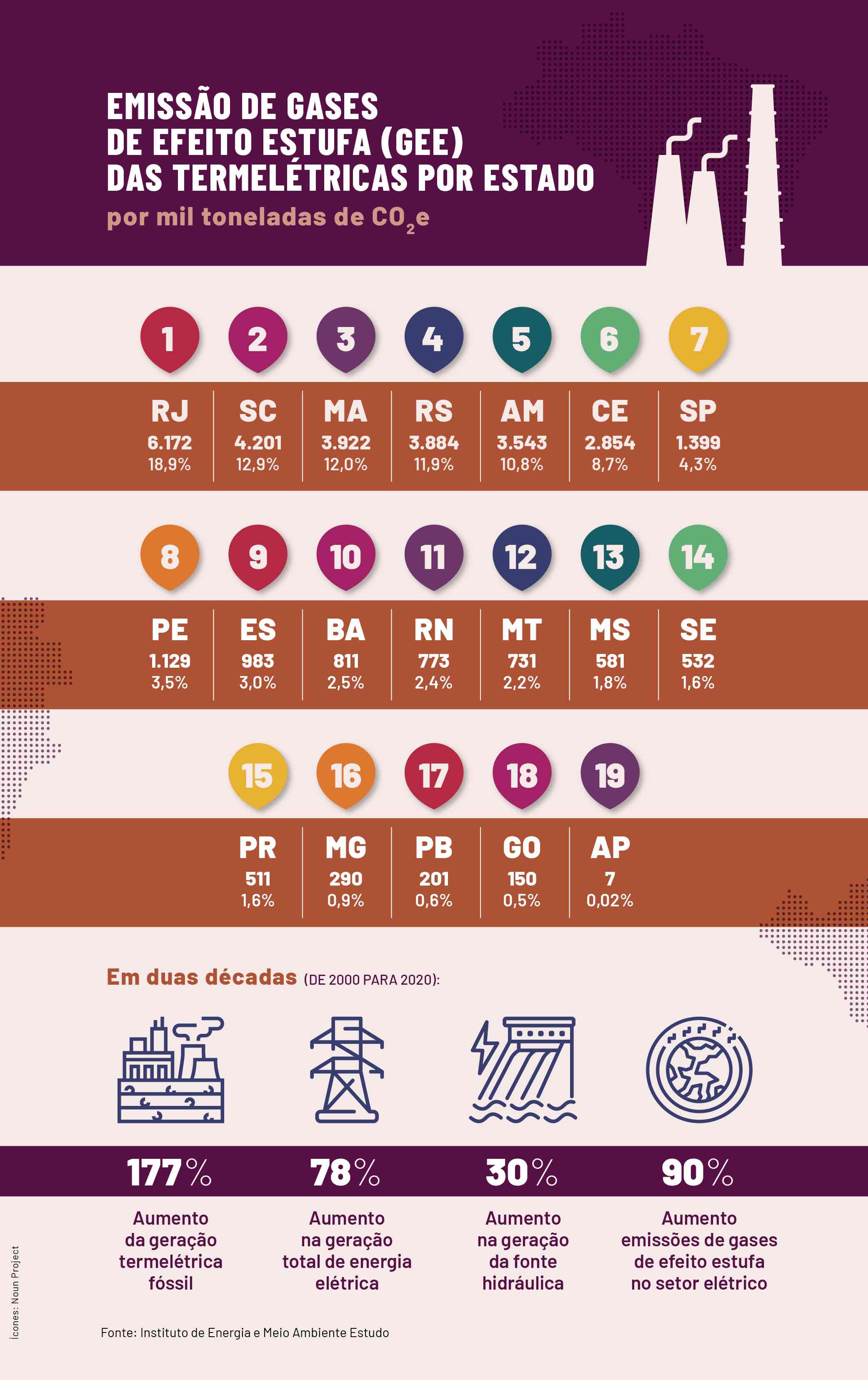 Segundo problema: as emissões de poluentes. Estudo do Instituto de Energia e Meio Ambiente aponta que a geração das usinas termelétricas aumentou de 30,6 TWh em 2000 para 84,8 TWh em 2020, quase o triplo. Isso teve impacto sobre a poluição. De acordo com a análise, “consequentemente, o total de emissões de gases de efeito estufa (GEE) no setor elétrico brasileiro aumentou 90% entre 2000 e 2020”.