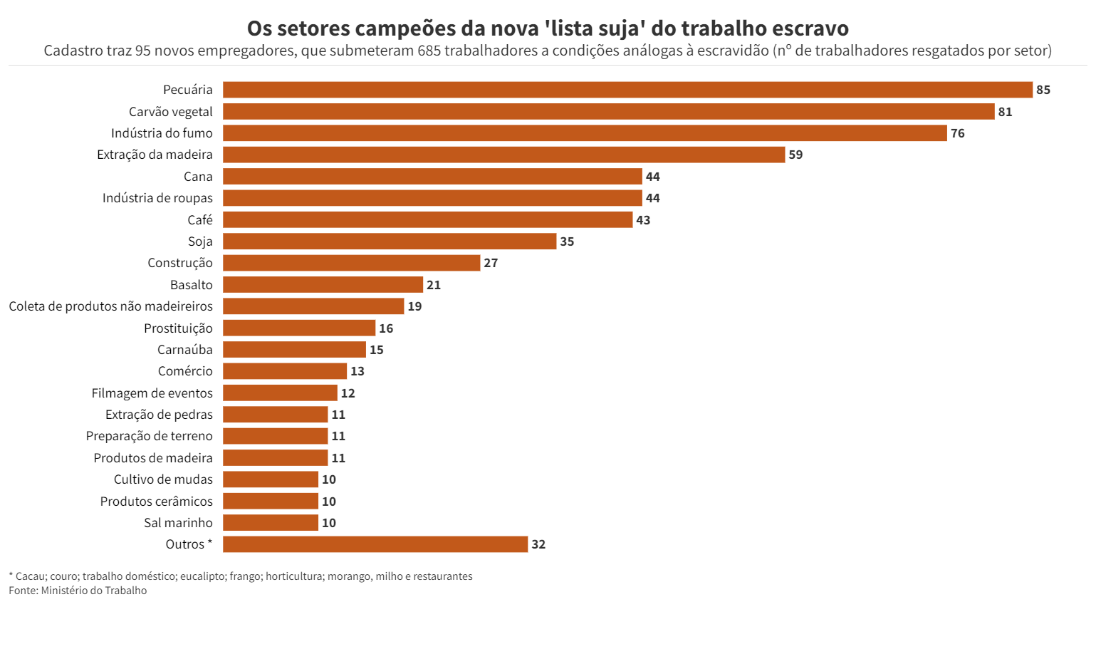 Além do maior número de trabalhadores resgatados, a pecuária também lidera o ranking por empregadores na nova “lista suja”, com 15 empresários, alguns deles fornecedores da JBS, Marfrig e Minerva, os três maiores frigoríficos do país. Entre eles está Carlos Roberto Tavares de Oliveira, responsabilizado por submeter à escravidão contemporânea 11 trabalhadores, entre eles um adolescente de 17 anos.