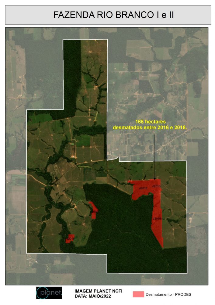 Em setembro, a Repórter Brasil perguntou à Minerva se o frigorífico havia abatido animais criados da Fazenda Rio Branco, de Chaules Volban Pozzebon, onde o Greenpeace constatou desmatamento ilegal de 165 hectares entre 2016 e 2018, uma área maior que o Parque do Ibirapuera, que tem 158 hectares.