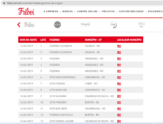 Ao todo, até julho de 2019, foram 1.316 bois abatidos pela companhia com origem nesta fazenda.