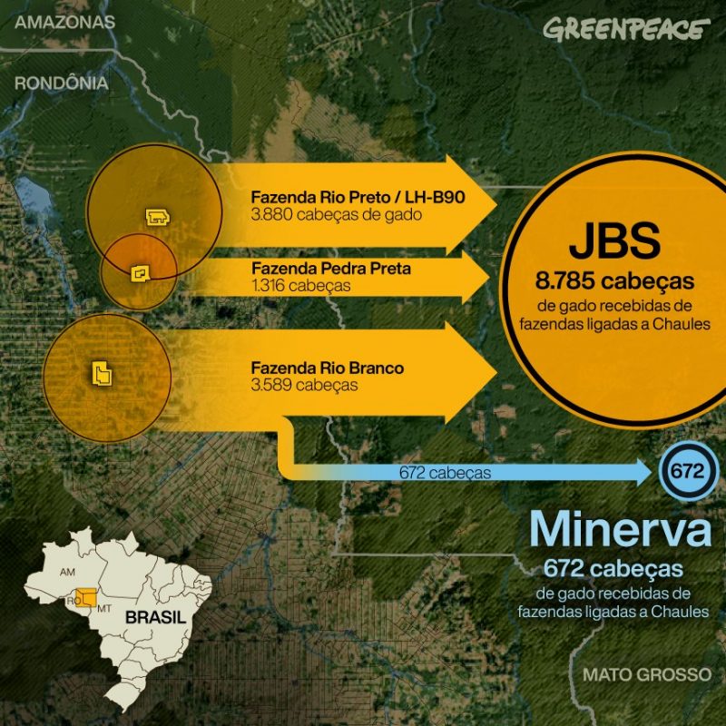 Um dos maiores frigoríficos do planeta, a brasileira JBS comprou 8.785 cabeças de gado de três fazendas que desmataram a Amazônia em Rondônia. As compras irregulares ocorreram durante pelo menos quatro anos, entre 2018 e 2022, sem que os sistemas de monitoramento da empresa barrassem os negócios. Todas as fazendas pertencem à mais famosa quadrilha de infratores ambientais do estado, cujo líder, Chaules Volban Pozzebon, está preso por extração ilegal de madeira e é considerado o maior desmatador do país, além de ter sido condenado por usar mão de obra escrava. É o que revela uma investigação inédita feita pela Repórter Brasil, em parceria com o Greenpeace Brasil e o Unearthed, braço jornalístico do Greenpeace.