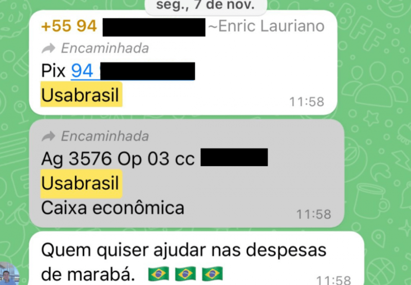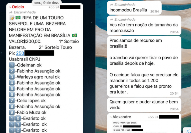 O ato de 3 de dezembro foi usado por bolsonaristas do sul do Pará como pretexto para engrossar a campanha de arrecadação de fundos para os acampamentos. Naquele dia, em outro grupo de WhatsApp, o pecuarista Alexandre de Araújo Freitas repassou vídeos e comentários sobre as manifestações. “Hoje foi top. Incomodou Brasília. Vocês não tem noção da repercussão.” Em seguida, Freitas escreveu: “Precisamos de recurso em brasilia!!!. o xandao vai querer tirar o povo de brasilia depois de hoje […] Quem quiser e puder ajuda e bem vindo”. Na sequência, o fazendeiro divulgou mais uma vez os dados do PIX da USA Brasil. As mensagens foram transcritas como publicadas, incluindo os erros de português.