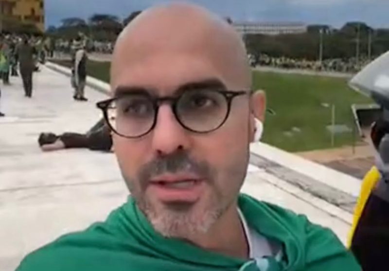 Mascarenhas se mostra surpreso com a reação das forças de segurança, que tentam impedir o avanço da multidão bolsonarista por meio de bombas de efeito moral lançadas de helicópteros. “É muita covardia, cara. Por que eles não fazem isso contra a esquerda?”.