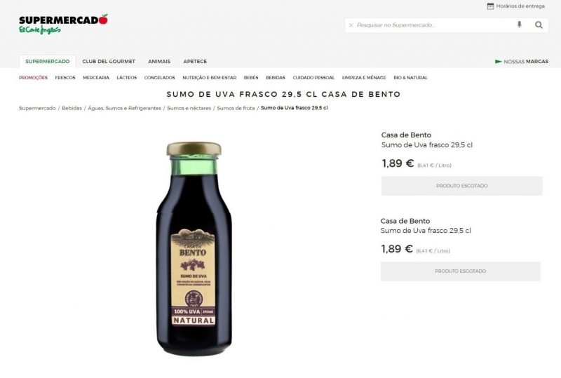 Rede espanhola El Corte Inglés, com lojas também em Portugal, apagou anúncio de suco de uva da Aurora após contato da reportagem (Foto: Reprodução)