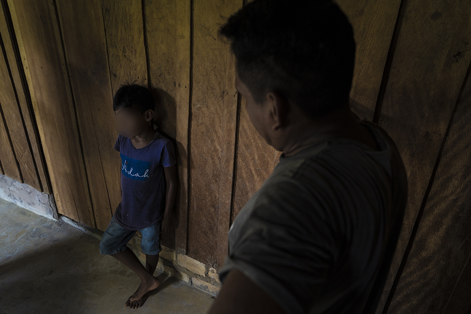 “Isso é provocado pelo mercúrio. Não adianta esconder”, afirma o chefe dos guerreiros Munduruku, Bruno Kaba, que nos acompanha durante a entrevista, apontando para as crianças sentadas em um banco.