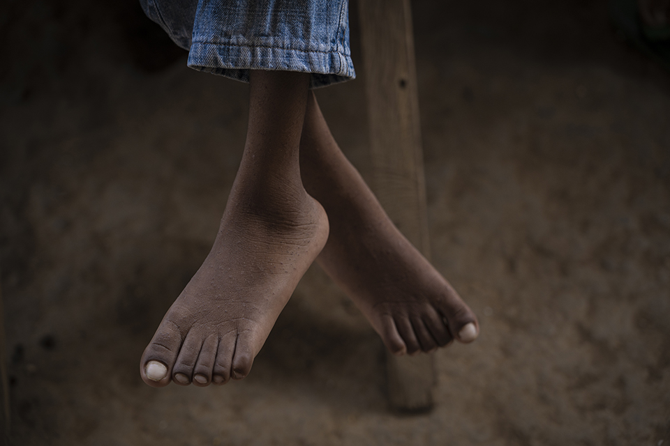 Isaías, de 11 anos, não anda, não fala e é carregado no colo pelo pai, que esculpiu em madeira uma poltrona para suprir a falta de cadeira de rodas. Os irmãos Hélio, 12, Vandir, 8, e Juliana, 5, também não andam, nem falam. Seus braços e pernas são atrofiados, e os joelhos estão inchados e com arranhões de tanto se arrastarem no chão.
