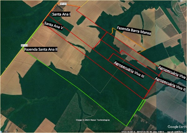 Além dos negócios feitos com as grandes tradings após os satélites revelarem o aparecimento da lavoura na área embargada, a família Lucion pode estar trabalhando para abrir uma nova área na propriedade, conforme constatou a reportagem quando esteve no município de Cláudia, em setembro de 2022. Flagramos um grande incêndio na borda sul da fazenda Santa Ana, na extremidade oposta onde está o embargo, onde mais de 400 hectares de floresta amazônica arderam em poucos dias. Conforme revelam imagens de satélite, o incêndio ocorreu no período em que a prática é proibida.