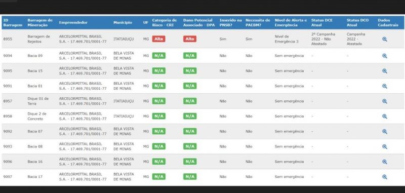 Já foram realizadas inspeções por órgãos governamentais em janeiro e fevereiro de 2023. A ArcelorMittal verifica as estruturas constantemente.