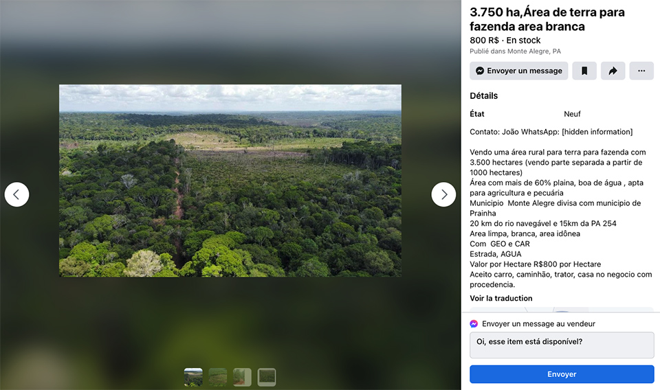 Um dos vendedores que oferecem terras na Amazônia a preços baixos se identifica como João. A equipe do Forbidden Stories fez contato com ele se passando como potencial cliente. Por R$ 1.200 por hectare, um preço três vezes inferior ao preço médio da terra d na região de Almeirim, no norte do Pará. João oferta fazendas que podem chegar a 8.000 hectares (ou mais de 8.000 campos de futebol).