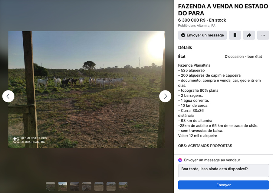 Contatada pelo Forbidden Stories, a Meta informou que estava analisando os anúncios no Facebook Marketplace para “identificar aqueles que podem violar suas regras”, e reiterou que a plataforma proíbe “a venda de terras localizadas em unidades de conservação” em seus espaços comerciais. “Determinar se uma determinada área pode ser vendida envolve uma análise jurídica complexa, que compete aos tribunais locais”, acrescentou o porta-voz.