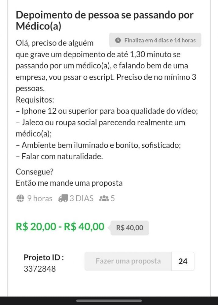 No caso da VintePila, por exemplo, a reportagem identificou um anúncio em que o contratante pedia que o freelancer, vestido de jaleco, gravasse um vídeo se passando por médico e falando bem de uma determinada empresa.