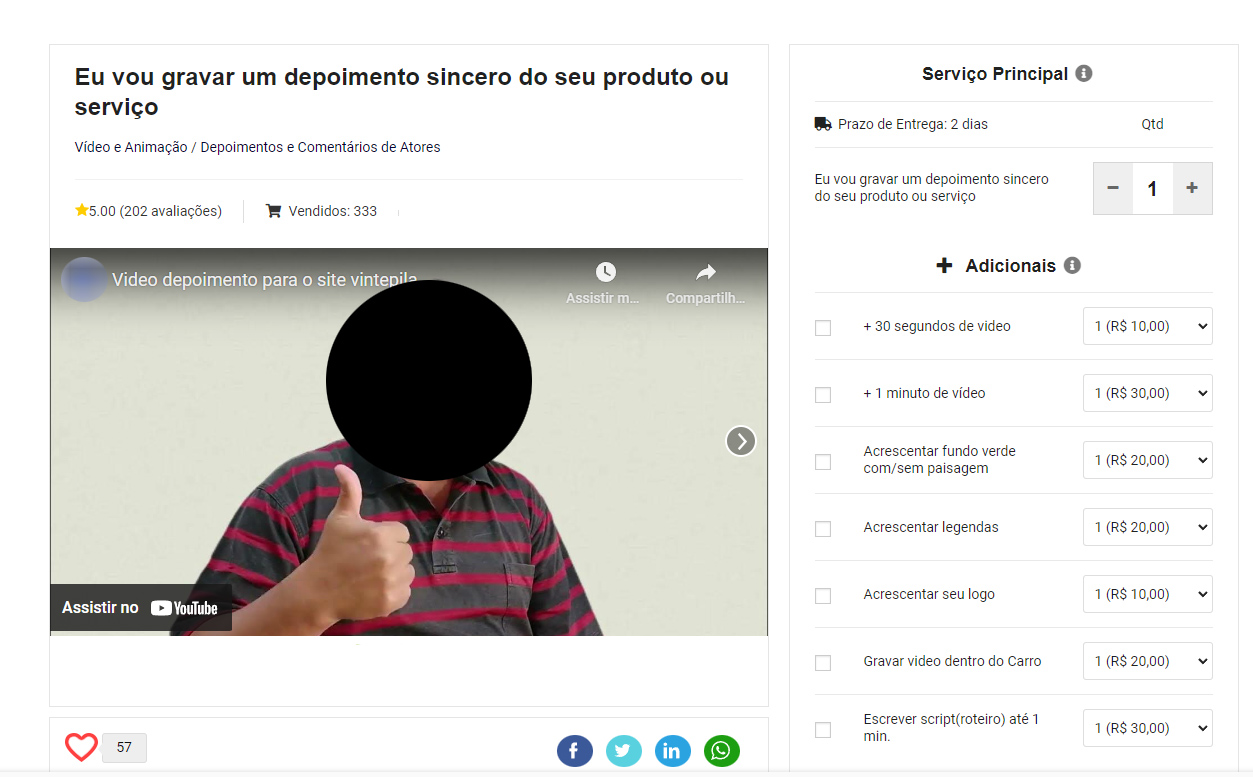 Em outras palavras, a plataforma permite apenas que freelancers ofereçam sua mão-de-obra, geralmente com slogans do tipo “eu vou dar meu depoimento para o seu produto”.