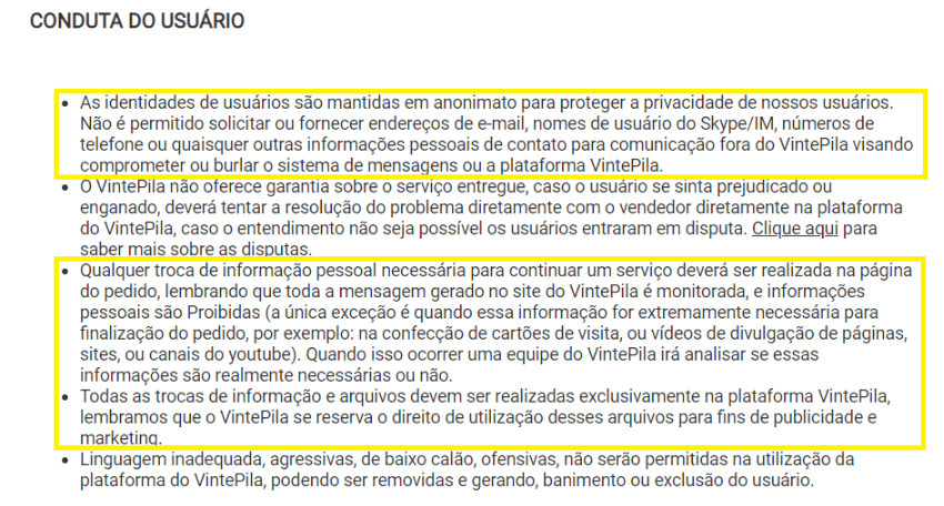 De maneira similar, os termos do Vinteconto também se eximem de responsabilidade legal, informando ainda que “é vedado aos usuários anunciar à [sic] venda ou comprar produtos que sejam proibidos ou violem a legislação vigente”.