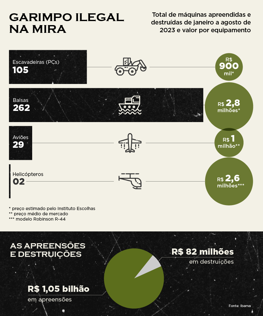 Desse total, mais de R$ 1 bilhão corresponde a equipamentos apreendidos, enquanto R$ 82 milhões se referem a peças efetivamente destruídas. A lista é vasta e inclui tratores, escavadeiras, balsas, dragas, aviões e helicópteros, além de motores, barcos, motos, caminhonetes e material de acampamento.
