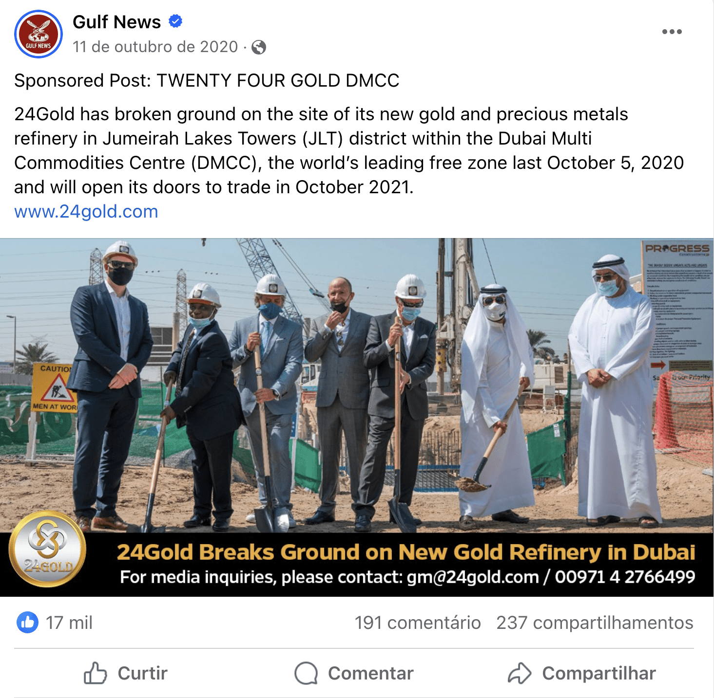 Apesar de a foto apresentar a 24 Gold como dona da refinaria de Dubai, a construtora responsável informa que a obra é uma encomenda de outra empresa ligada à família Goetz — a AGR.