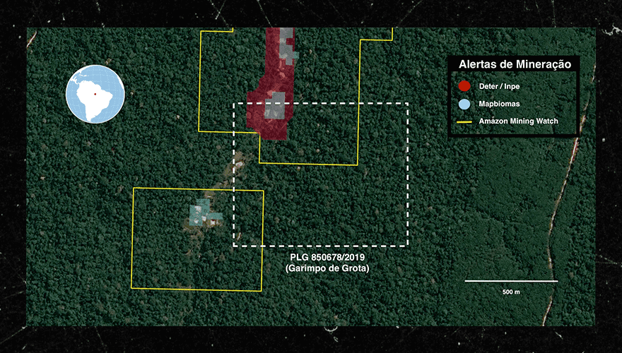 Para constatar se houve ou não atividade garimpeira nas lavras de Grota, a reportagem extraiu dados das plataformas Amazon Mining Watch, da Earth Genome e do Pulitzer Center, e MapBiomas, além de informações do Deter, o sistema de verificação de desmatamento do Instituto Nacional de Pesquisas Espaciais (Inpe).