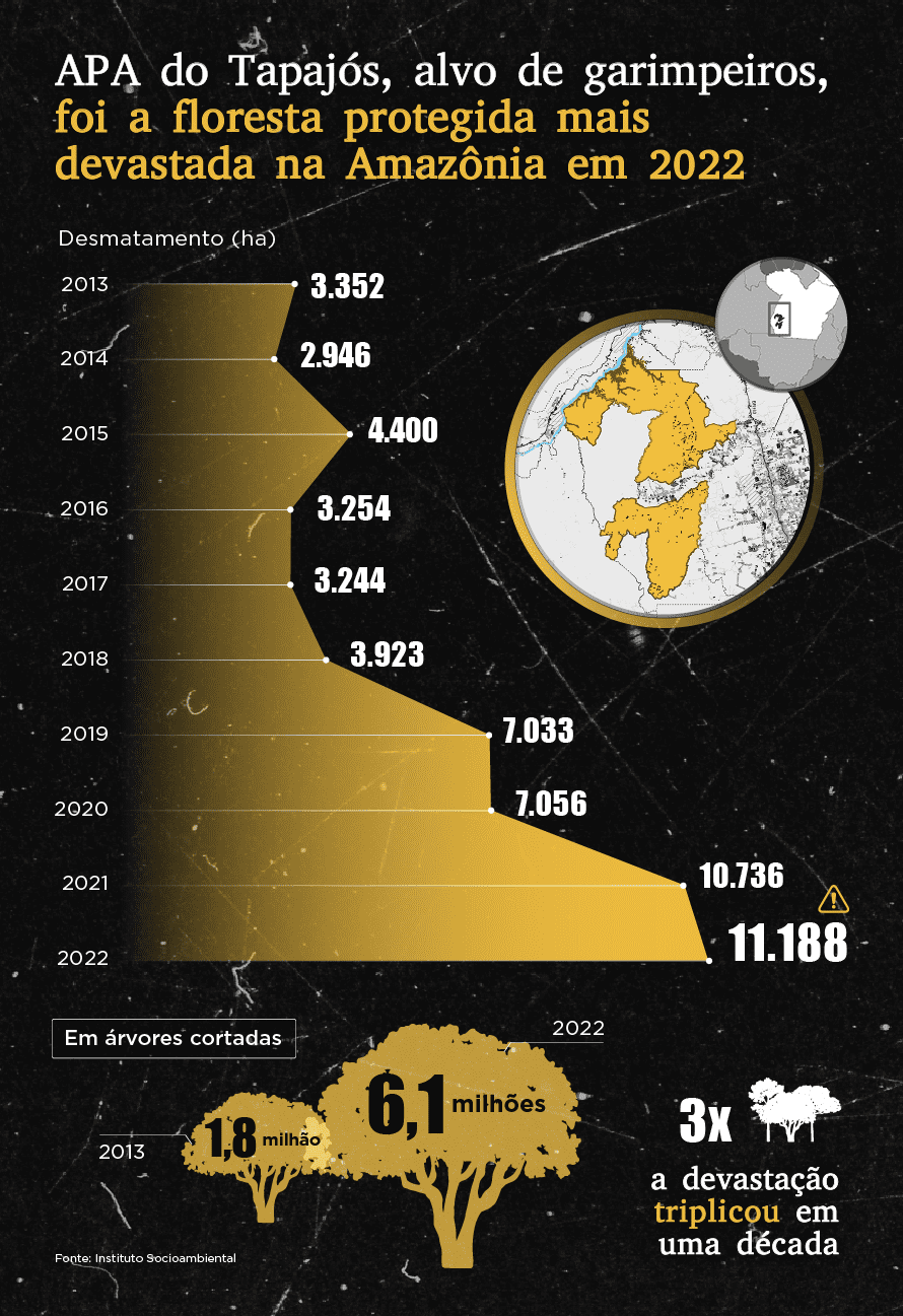 Localizada em Itaituba (PA), a APA do Tapajós é cortada pela estrada Transgarimpeira e alvo frequente de garimpos ilegais. Nos últimos cinco anos, o desmatamento na área triplicou, chegando a 113 km² em 2022, segundo dados do Instituto Socioambiental (ISA). A área é equivalente a 70 parques do Ibirapuera, em São Paulo.