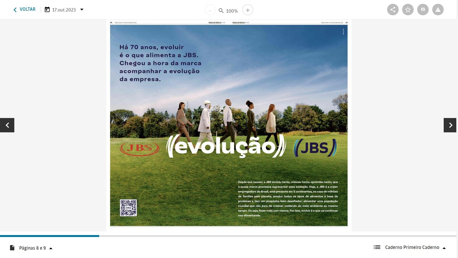 Headlines about the area of sustainability and social practices are also highlighted on JBS’s website, and the company has sponsored content focused on sustainability on media such as Valor Econômico, Exame and Poder360. Only advertising its new logo on two pages of the October 17 printed edition of newspaper Folha de S. Paulo cost around R$1 million.