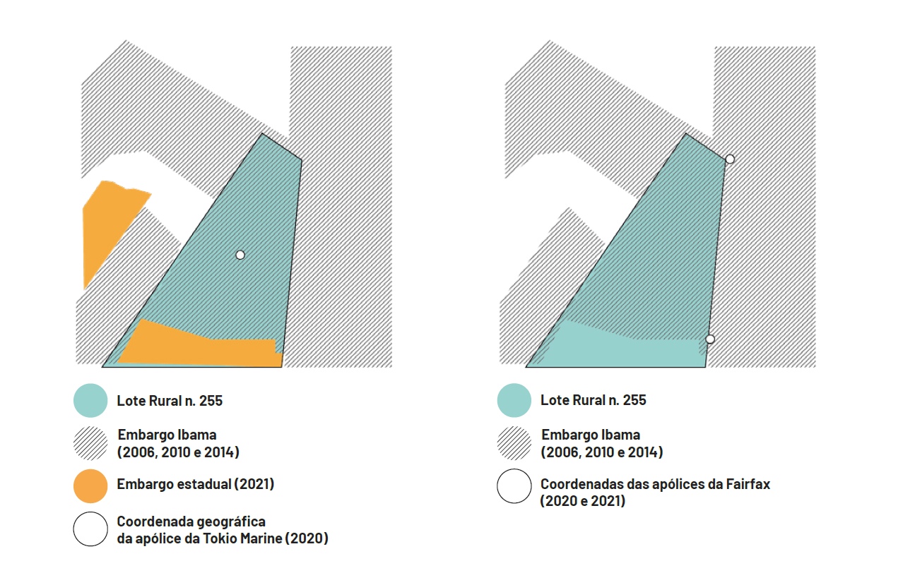 Assim, foi possível identificar que as subsidiárias locais das empresas Allianz (Alemanha), Mapfre (Espanha), Fairfax (Canadá), Tokio Marine (Japão) e Brasilseg – parceria entre a Mapfre e a BB Seguros, empresa do Banco do Brasil – forneceram seguro para quatro fazendas com 1.968 hectares embargados, ao todo. Em alguns casos, as coordenadas indicadas pelo Mapa incidem sobre a área embargada. Em outro, 100% da propriedade segurada estava embargada quando os seguros foram contratados.